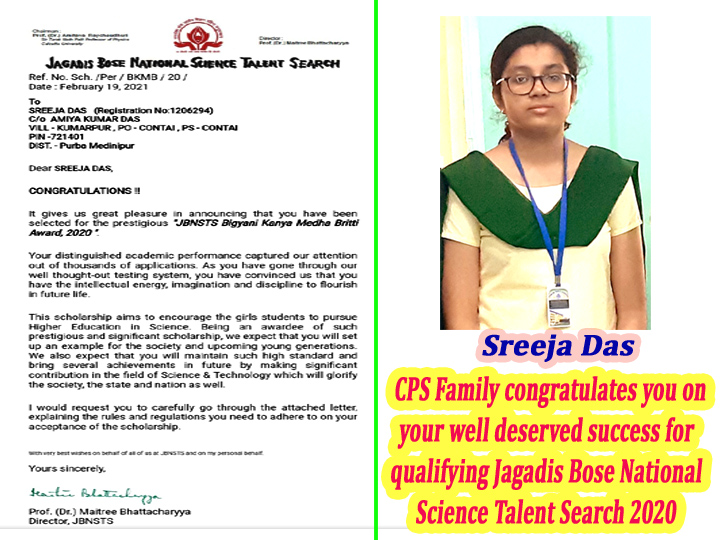 Awardees of JBNSTS 2020 Ayan Dandapat (Junior Scholarship Awardee) Kasita Panda (Junior Scholarship Awardee) Soujatya Pahari (Junior Encouragement Awardee) Congratulations for qualifying Jagadis Bose National Science Talent Search 2020 (JBNSTS). CPS Family is proud of you